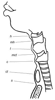 Рис. 19.1. Схема порогов (выступов) и впадин предгортанной области (по Escat E., 1908): h – выступ подъязычной кости; mh – подъязычно-щитовидная впадина; t – выступ щитовидного хряща; mct – впадина межперстневидно-щитовидная; c – выступ дуги перстневидного хряща; ct – подгортанный выступ (первые кольца трахеи); s – надгрудинная впадина