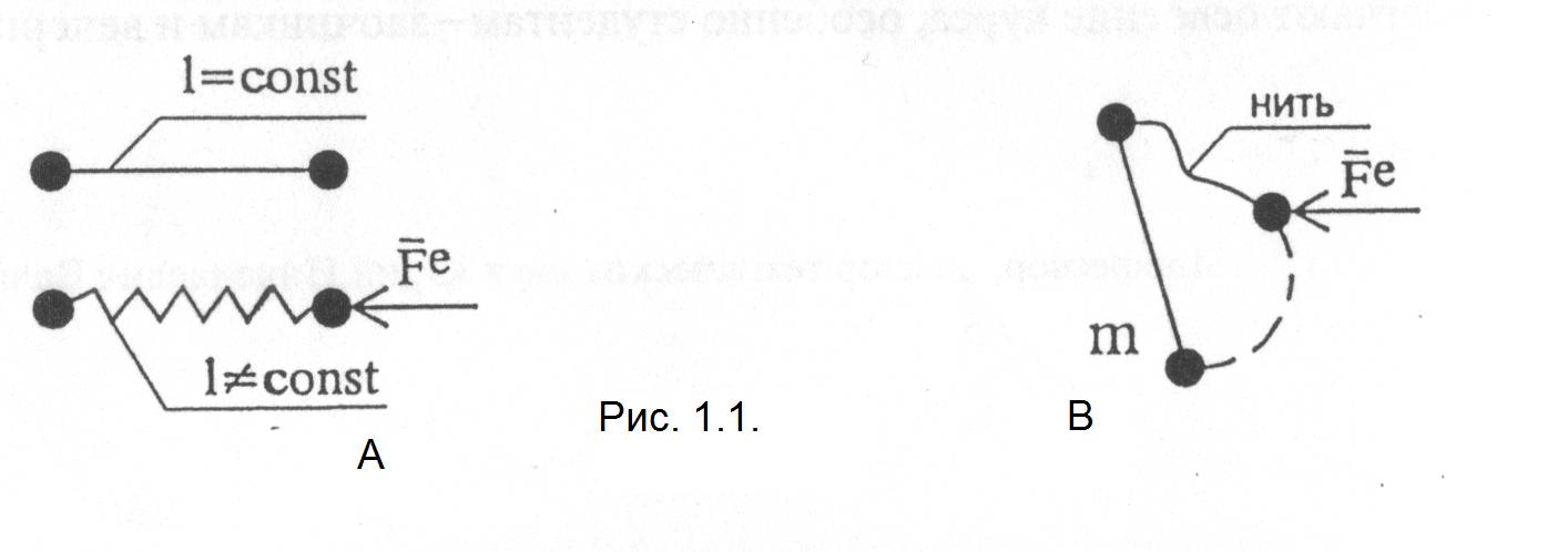 В случае, когда М.С. имеет только внутренние связи, ее движение в пространстве ничем не ограничено и такая система называется свободной. В части II – кинематике рассматривается вопрос о числе степеней свободы свободной неизменяемой системы с (“i =1-n”) неограниченным числом “n” материальных точек. Там, базируясь на выражении S=3n-K, где “К” – число внутренних связей, мы приходили к выводу, что свободное абсолютно твердое тело (Т.Т.) имеет S = 6 степеней свободы и для описания его механического перемещения в пространстве нужно соответственно б кинематических уравнений движения. Задачей динамики твердого тела будет вывести эти уравнения, базируясь на дифференциальных уравнениях движения и интегрируя их. Связи, налагаемые на М.С. могут быть как стационарными (неизменяемыми), так и односторонними. Например (Рис. 1.1.) в случае “А” точки системы связаны жестким невесомым стержнем постоянной длины “I”= const. В случае “В” они вязаны пружиной, которая может менять свою длину “I” под действием внешних сил “Fe”, действующих на систему, и эта система геометрически изменяемая, а связь неудерживающая.