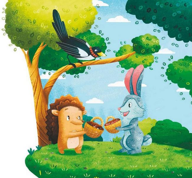 Отсыпал Ежонок Зайчонку половину своих грибов. А Зайчонок отдал Ежонку половину своих ягод. Попрощались они и – довольные – пошли каждый к своему дому.
