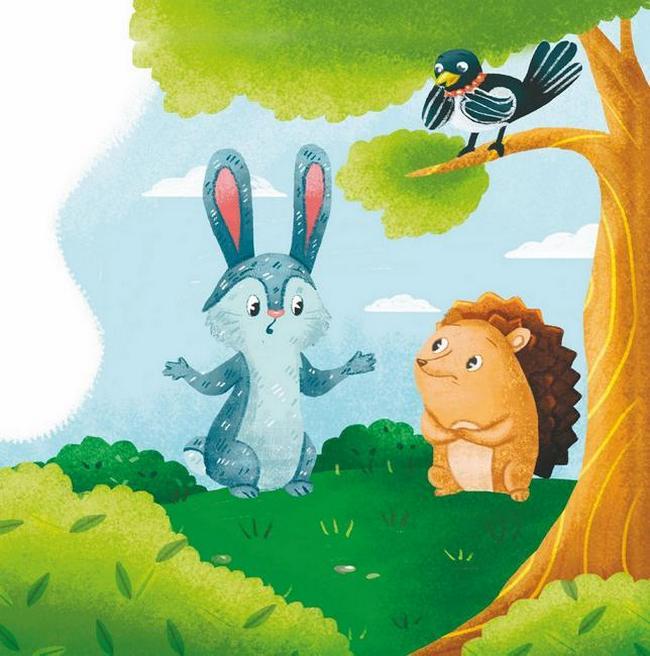 На полянке посреди леса Ежонок и Зайчонок встретились. Запыхались оба от быстрого бега: еле дух переводят. А Сорока уже на ветке сидит. Сверху вниз на них посматривает.