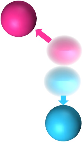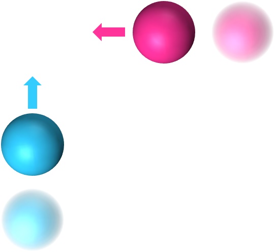 Розовый мячик при этом не воздействовал на синий мячик, поэтому он сохранил свою скорость справа налево. Но синий мячик воздействовал на розовый и передал ему частично свою скорость снизу вверх, а сам, в результате упругости полетел с гораздо меньшей скоростью вниз.