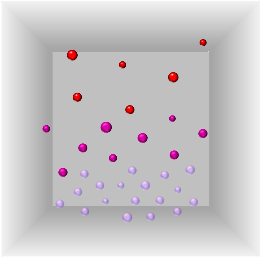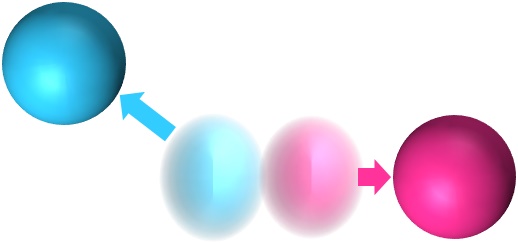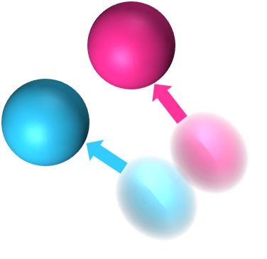 … разлетаются в противоположных направлениях. Причём, если считать их совершенно упругими, то можно утверждать, что зелёный мячик полетел с бывшей скоростью розового мячика, а розовый мячик, соответственно, с бывшей скоростью зелёного мячика. Значит можно сказать, что при прямом столкновении упругие частички обмениваются скоростями.