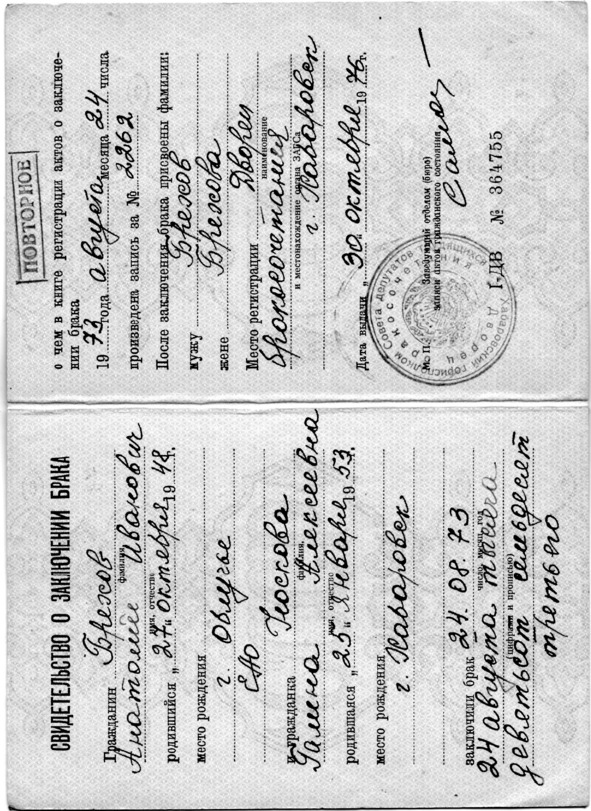 Свидетельство о заключении брака Бреховых- Анатолия Ивановича и Носковой Галины Алексеевны 30.10.1973 г.г.Хабаровск, ул. Пушкина д.62.