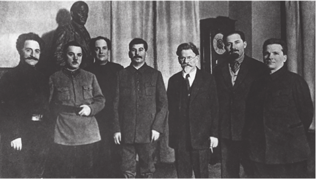Г.К. Орджоникидзе, К.Е. Ворошилов, В.В. Куйбышев, И.В. Сталин, М.И. Калинин, Л.М. Каганович и С.М. Киров в день 50-летия Сталина
