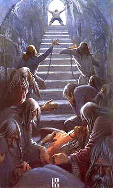 Третья работа на эту же тему называется «Илья Муромец освобождает узников». Почти всю площадь картины занимают ступени темницы, взбегающие снизу вверх к распахнутым Ильей Муромцем дверям тюрьмы. Свежий воздух свободы ворвался в сырой подвал, и потянулись к свету узники: некоторые робко, а двое – истово, решительно, словно сию же минуту им надо подняться и завершить какое-то очень важное дело.