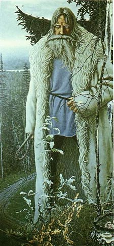 В облике этого старца художник попытался представить мудрость человеческого опыта. Поднявшийся великан соединил собой два мира: небо и землю, подобно мифологическому «древу жизни» – соединителю двух сфер. Васильев напоминает, что на Земле произрастают не только цветы и деревья, но и человеческие жизни. Словно корнями врос старец в землю, еще не проснувшуюся от холодного сна. Мех его шубы, схожей своей фактурой с заиндевевшими кронами деревьев, свидетельствует о былой связи его с зимним лесом. Человек поднялся из самой природы и достиг таких высот, что головой подпирает небесный свод.