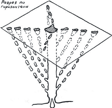Рис. 15. Схема горизонтального разреза вертикального канала и его лучей, по которым происходит наклонная миграция рассола по льду (по В. Л. Цурикову, 1976)