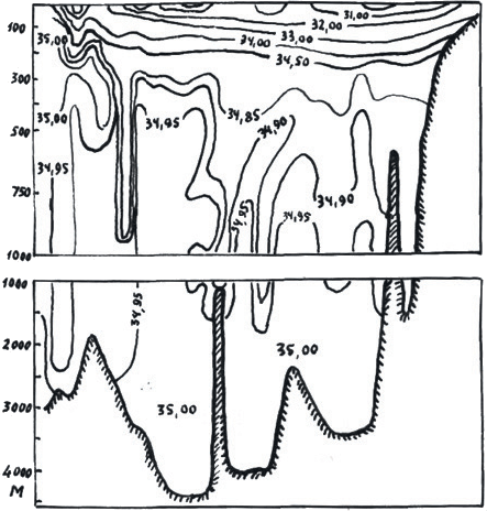 Разве не удивительно, что температура воды в глубине Атлантического океана, вблизи экватора между Южной Америкой и Африкой, составляет 0° ÷ 0,5 °C, то есть столько же сколько подо льдами Северного Полюса? Если мы сравним соленость глубинных вод на экваторе и на Полюсе, то тоже не обнаружим почти никакой разницы. Значит, и плотность глубинных вод всей океаносферы оказывается практически одинаковой. Из таких заключений легко сделать ошибочный вывод, что для глубинных вод Мирового океана не существует ни внешних (например, ветра), ни свойственной самой воде причин (различий в плотностях), способствующих перераспределению глубинных вод по всему земному шару.