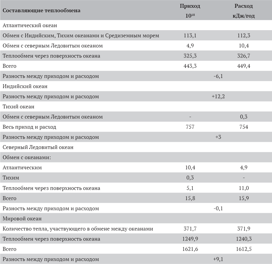 Из этого баланса следует, что в наше время необратимо отдаёт тепло в атмосферу лишь Атлантический океан. Причём подавляющая доля его потерь относится на акваторию Северного Ледовитого океана, а остальное на теплообмен через поверхность океана. Это не противоречит сделанному нами выше заключению, что большая часть Северного Ледовитого океана, а именно, вечно замерзший и замерзающий Арктический бассейн, тепла в атмосферу в течение года необратимо вообще не отдает. Здесь зимние потери, выражающиеся лишь в высвобождении теплоты кристаллизации, летом полностью восстанавливаются теплотой плавления. Значит, потери тепла атлантических вод происходят на незамерзающих морях Северного Ледовитого океана, а именно: Норвежском, Баренцевом и отчасти Гренландском. В Атлантике теряется некоторая часть тепла, поступающая и из других океанов.