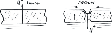 Рис. 6. Зимнее кондуктивное выделение теплоты кристаллизации через лёд летом восстанавливается намного более интенсивным конвективным возвратом теплоты плавления со стоком талой воды при одновременном всплывании льда на воде.