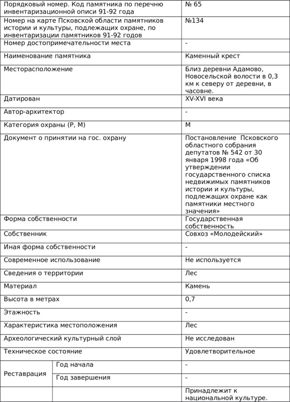 Информация о каменном кресте в деревне Адамово имеется только в районном краеведческом музее. Информация из инвентаризационного списка памятников истории и культуры Струго-Красненского района приведена в Таблице 1.