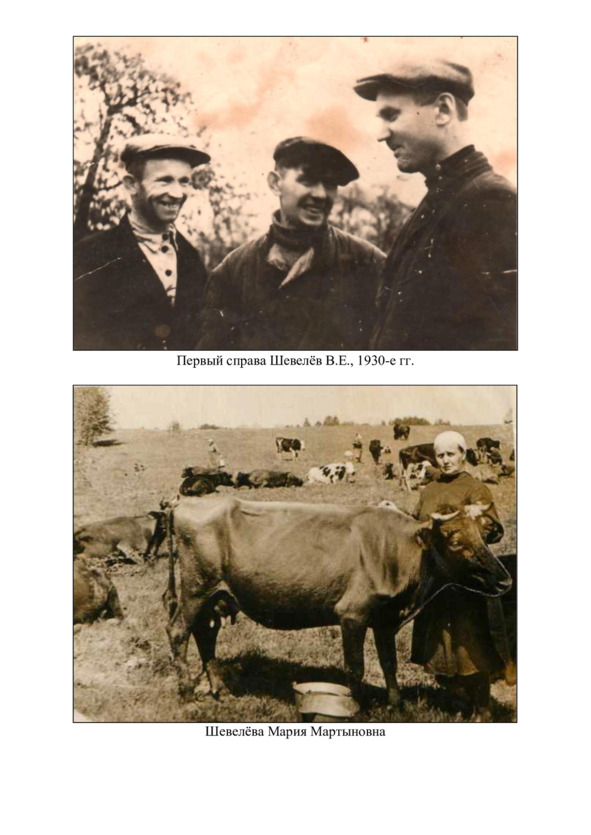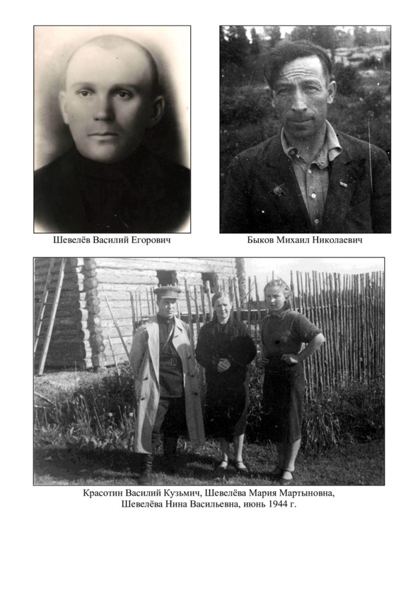 Партизаны связались с Шевелёвым и через него со всем населением. Деревня была к нас дружная. Когда немцы предложили выбрать старосту, то все в один голос настаивали выбрать Шевелёва, знали, что он не подведёт. Шевелёв оправдал наше доверие. Несмотря на то, что в двухстах метрах от деревни в совхозе «Искра»15 стоял большой гарнизон немцев, у нас партизаны чувствовали себя как дома. Особенно часто к нам стали заходить партизаны с весны 1942 года. Приходили из группы Красотина, из отряда Чебыкина, Букина, Чернышева, Трофимова и др. Часто приходили и тогда, когда в деревне были немцы. Колхозники знали, что в деревне партизаны. Никто никогда не выдал их. Часто ночевали у нас. Зимой месяцами жили в банях. По распоряжению Шевелёва колхозники по очереди готовили и носили им пищу. Для проходящих отрядов Шевелёв собирал хлеб, мясо, яйца, масло и другие продукты. Зимой собирал тёплые вещи и всё отправлял в отряды.