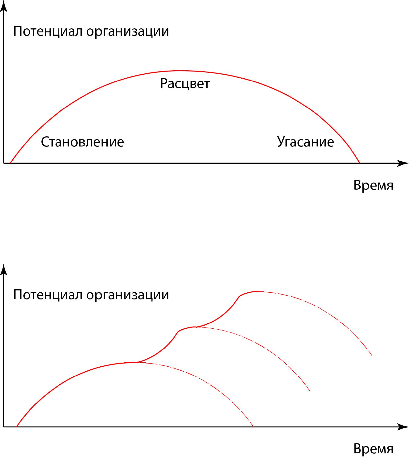Любая организация проходит за время своего существования три основных этапа: становление, расцвет и угасание. Закон развития обусловлен фундаментальным физическим законом неубывания энтропии: если в некоторый момент времени замкнутая система находится в неравновесном состоянии, то в последующие моменты времени наиболее вероятным следствием будет монотонное возрастание её энтропии. В нашем случае это означает, что, если организация испытывает воздействие внешней среды, а количество ее активностей остается неизменным, она неизбежно погибнет с течением времени (верхняя часть рисунка 15). Избежать этого можно, только динамически наращивая активности: корректируя профиль деятельности, открывая новые точки сбыта, расширяя спектр продуктов, выходя на новые рынки и т. д. В этом случае есть возможность вывести организацию на кривую прогрессивного развития (нижняя часть рисунка 15). В формулировке основателя компании IBS Анатолия Карачинского Закон развития звучит так: «Бизнес не движется по прямой. Он либо идет вниз, либо идет вверх. Третьего не дано». (Журнал «Коммерсантъ Секрет Фирмы», 2006).