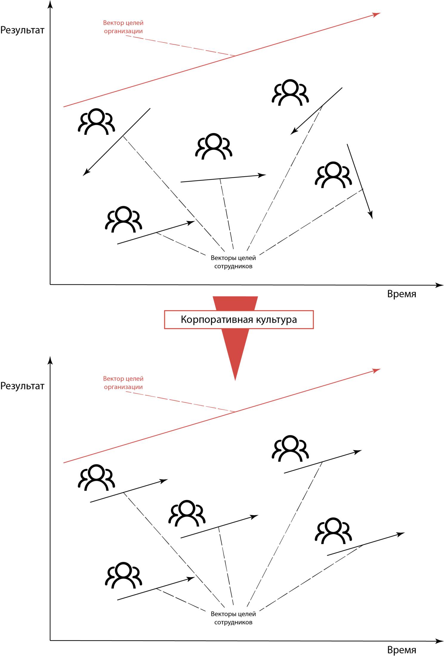 Смысл корпоративной культуры – создание коллектива единомышленников, который живёт по единым принципам с одинаковыми целями, коллектива, в котором царит Доверие. Корпоративную культуру в этом смысле можно уподобить магнитному полю, ориентирующему индивидуальные векторы целей в направлении вектора целей организации. Одна из задач управления – следить за тем, чтобы это поле всегда оставалось достаточно мощным.