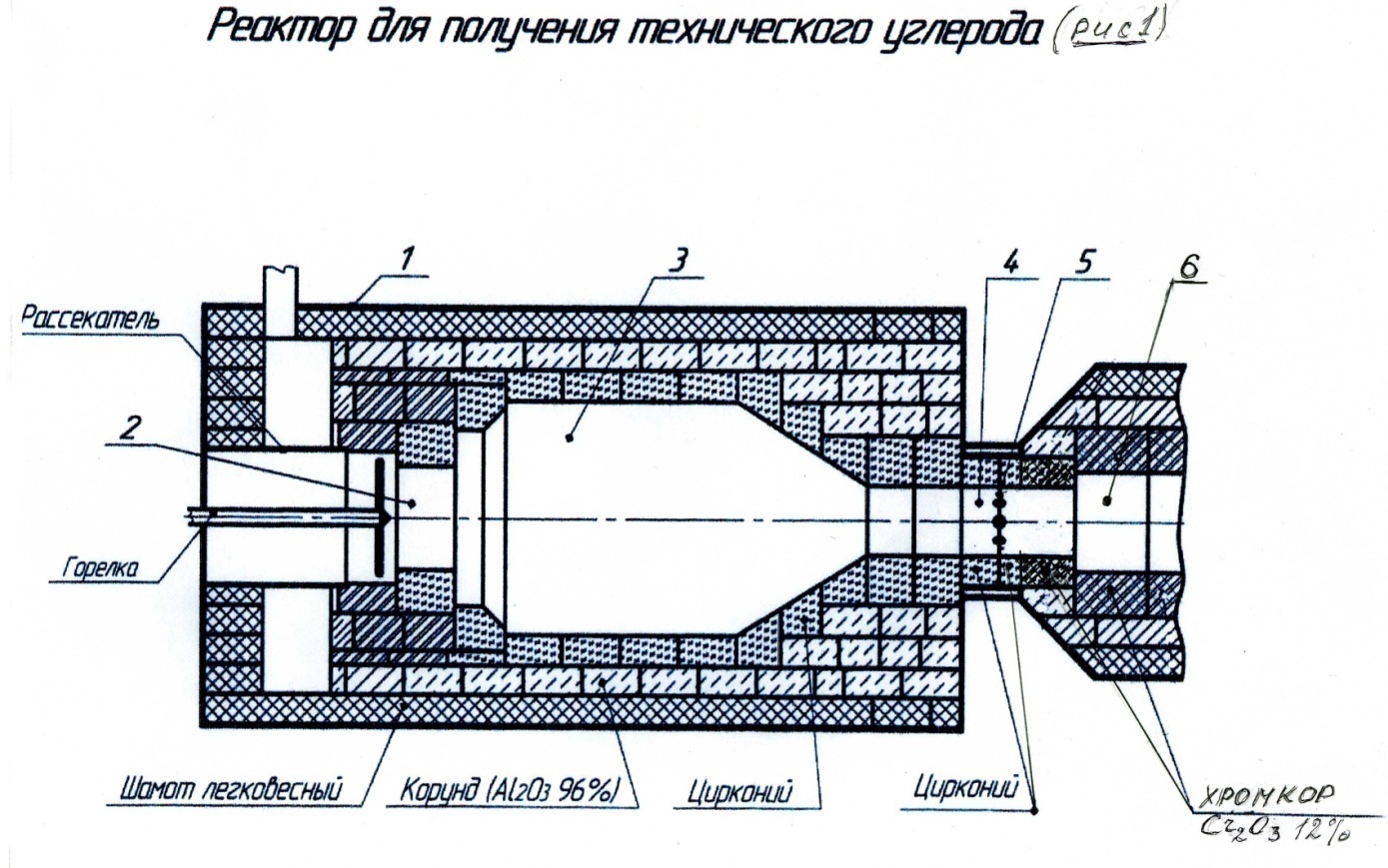 Как уже отмечалось, обслуживание реакторов с циркониевой камерой горения сложнее и требует более высокой квалификации обслуживающего персонала. Поэтому нужно рассмотреть необходимые условия правильной эксплуатации таких реакторов. На Рис/1/ показан эскиз реактора с циркониевой камерой горения, включающий: 1—корпус реактора, 2—камера смешения топлива с воздухом, 3– камера горения, 4—смесительное сопло, 5—плоскость ввода сырья в смесительное сопло, 6—начальная часть зоны реакции. На нём указаны и основные огнеупорные материалы футеровки камеры горения/3/, смесительного сопла/4/ и начальной зоны камеры реакции реактора /6/. Как показано на эскизе огневой слой камеры горения /3/ и основная часть смесительного сопла /4/ футерованы циркониевыми блоками. Последний блок смесительного сопла и блоки начальной части зоны реакции изготовлены из хромистого корунда содержащего 12% Cr₂O₃. Огнеупорность этого материала, как уже было указано, достигает 2125⁰С. Этот материал можно заменить шпинелью с содержанием 28,5%мас. MgO и 71,5%мас. Al₂O₃. Целесообразно также испытать в этой зоне хромистый корунд с содержанием окиси хрома 20—25%. Остальная часть зоны реакции футерована корундовыми огнеупорами с содержанием окиси алюминия ≥99%.