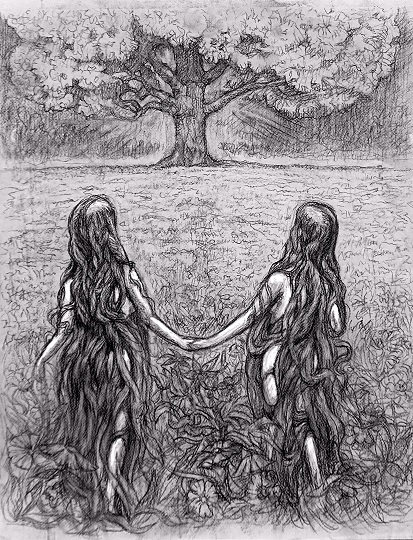 Вековые дубы укрывали сестер от ненастья, и теплый мох служил им ложем во время сна. Покрывалом для них были собственные волосы: они стекали шелковистыми волнами по девичьим спинам до самой земли. Небесные птицы пели им колыбельную на ночь, а утром будили, едва проглядывали первые ласковые лучи. Умывались сестры чистой росой, и звери лесные не ходили по их следу тропою охоты. И не знали девушки никакой нужды. И все для них было понятным и ясным.