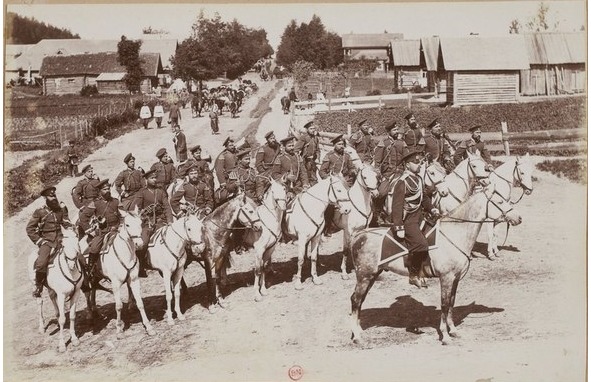 Эта фотография присутствует одновременно в двух книгах: у Дональда Томпсона и у Малколма Гроу. Гроу поясняет: казаки вступили в горящую галицийскую деревню, чтобы зачистить ее от австро-немцев, впереди едущие смотрят в сторону, где только что разорвался снаряд.