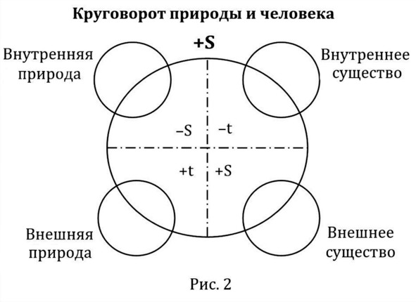 Теперь нам необходимо проверить правильность расстановки элементов в этой структуре Нави рисунка 2. Мы здесь имеем в виду пока только индивидуальные природы человека. Итак, внешнее существо обычного человека мы разместили в положительном пространстве. Тогда его внешняя природа получает для себя сектор положительного времени, как его зеркальная противоположность – нижний полукруг. Мир времени является внутреннем временем мира Пространства, его проекцией на него, поэтому мы его пометили прописной буквой «t». Внешнюю природу мы разместили в секторе положительного времени, считая наше будущее положительным. Мы получаем нижний полукруг структуры полностью относящимся к обычному внешнему человеку и его внешней природе.