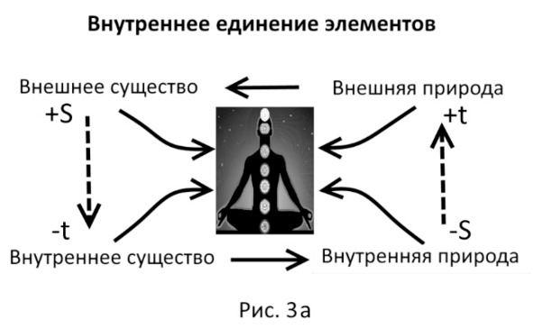 Явно, по рисунку 2, за её сектором отрицательного пространства следует сектор положительного времени внешней природы. Внутренняя природа далее воздействует своей тонкой материей на внешнюю природу, потому что для неё она будет иметь свойство «передатчика». Опять же, переходя границу сектора элемент меняет фазу своего состояния. Мы подобные взаимодействия пар элементов показали на рисунке 3а пунктирными стрелками.