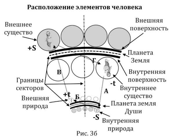 Давайте снова начнём с внешнего существа человека. Его мы показали расположенным на внешней поверхности планеты Земля, внутри «круга». Он находится в положительном пространстве. Сектора на рисунке 3б мы разделили пунктирными линиями, чтобы как-то обозначить их границы. Они, конечно, выглядят не так, как должны бы выглядеть, но по-другому их нам наглядно никак не показать.