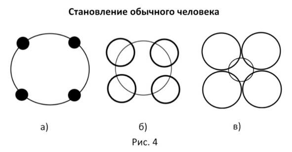 В самом начале его становления, в начале эволюции человека, все его четыре элемента оказываются точечными, свёрнутыми до своих минимальных параметров. Такое начало круговорота показано на рисунке 4а. В середине процесса становления уже происходит расширение времени и пространства внутри его четырёх элементов и сжатие центрального круга. Мы получаем нечто подобное рисунку 4б. На нём мы видим, что центральный круг сузился, а четыре элемента круговорота расширились за счёт него. В конце процесса становления человека мы уже должны будем получить максимальное расширение элементов круговорота и полное сужение центрального круга. Это показано на рисунке 4в.