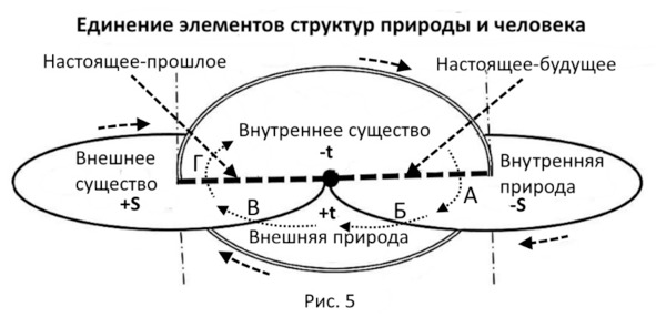 Внешняя природа, получив энергию от внутренней природы, передаёт её далее внешнему существу. Здесь необходимо уточнение: передача энергии осуществляется через проекцию из плоскости времени на плоскость пространства. Это может вносить и обязательно вносит искажения в структуру энергий. Такая передача энергии показано точечной линией В.