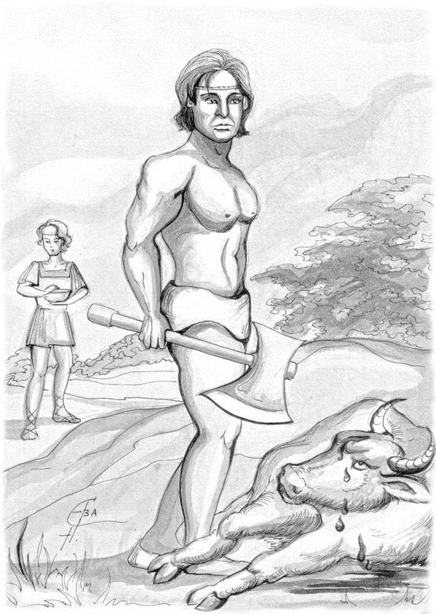 Хор закончил петь. Родитель явился на медный свод небес, что б блистать теням и людям, черным и белым небесам земли. В шеренгах громкие возгласы не сдержавшихся солдат. Мальчик и девочка помогают. Они вливают в пламя душистое масло. Величество вдыхает аромат радушными вспышками пламени. Жертвователь омыл руки водой из обложенной цветами лохани. Мальчик держал короб с ячменем. Он подошёл к молодой телице. В руке острый топор.