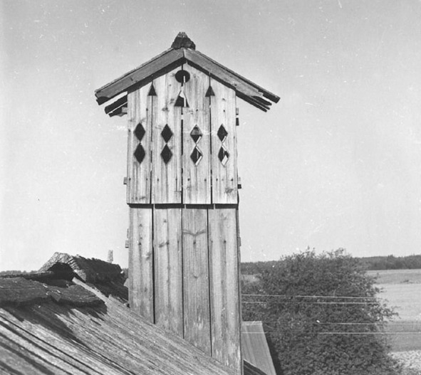 На первой фотографии деревни на избах не видно труб. А на другой, вроде б они, но причудливые. Это как раз дымники – дым из избы поднимается на чердак и утягивается наружу, выходя через фигурные отверстия.