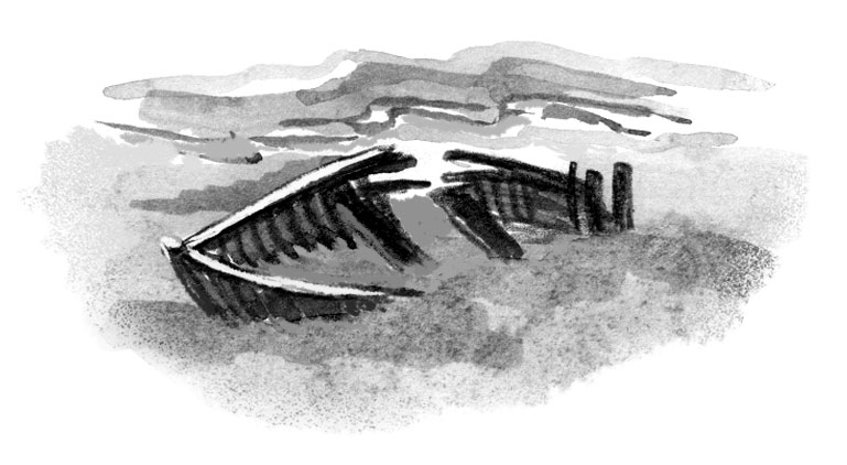 И, отвернувшись от жены, он пошёл к лодке. Там дурачок Петруша, стиснув зубы, дрожа и прыгая на одной ноге, тащил лодку в воду.