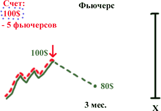 Эффект плеча при игре на понижение цены. Так же как и в сделке Long (рис. 2.5), при игре на падение по фьючерсам можно использовать эффект плеча. В текущем примере плечо составило 1 к 5 и без использования заемных акций или денег.