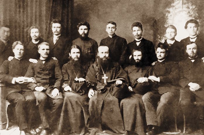Архимандрит Антоний (Храповицкий) (в центре) с иеромонахом Сергием (Страгородским) и студентами Академии