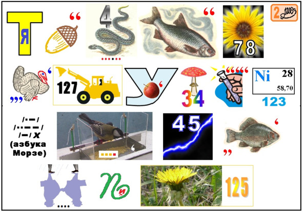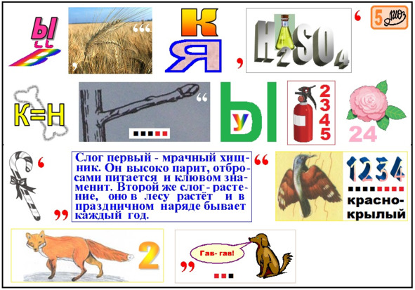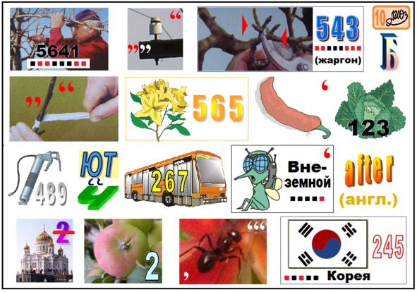 1). Для расширения кругозора садоводов, во многих ребусах встречаются картинки с названиями животных-вредителей, грибов и растений. Их названия написаны красным шрифтом, указывающим, что они не читаются. Читаются только некоторые буквы, заменённые точками (не красного цвета). Требуемый порядок расположения этих букв может быть изменён и указан в горизонтальной или вертикальной строке. Для получения дополнительной информации в рисунок ребуса могут быть введены слова: «Яд!» или «Ядов!» (ядовито!), предупреждающие об их ядовитости. Эти слова в ребусе также не читаются.