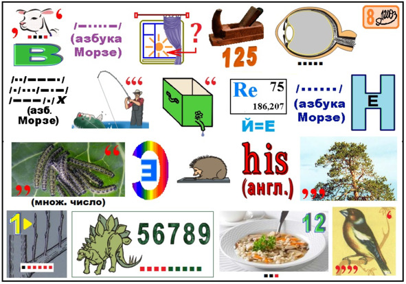 5). В трудных случаях (когда трудно определить границу между соседними рисунками) фрагмент ребуса, взятый в одну (тонкую) рамку, является одним (а не несколькими) рисунком.