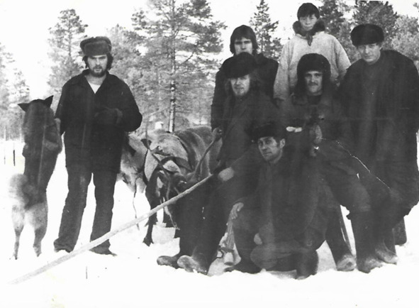 1977 год. Компрессорная станция «Орт-Ягунская». Очередной приезд аборигенов на базу. В малице на нартах – Анатолий, младший сын Ивана Семеновича Сопочина. Рядом с ним – строители КС и я со своим закадычным дружком Левкой.