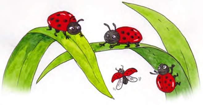 Кузя был как все его братья и сестры: у него были такие же усики, такие же лапки и такие же красные крылышки с двумя черными точками. Две точечки – потому что жучок, был ещё маленький, ведь только у взрослых божьих коровок бывает по многу пятнышек на крылышках.