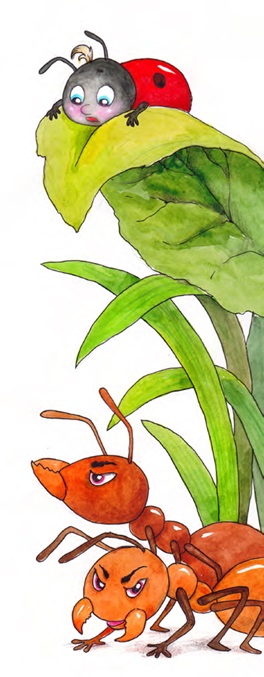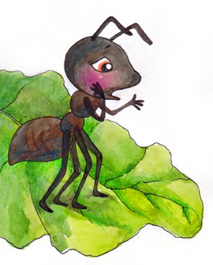 Пока наш маленький жучок размышлял, как ему поступить, листик на соседней ветке, стал двигаться, и из-под него выглянули усики. Кузя немного испугался, потому что подумал, что это рыжий муравей. Но усики принадлежали крошечному, черному муравью. Это был даже не муравей, а муравьишка.