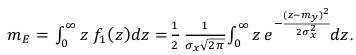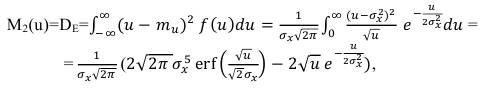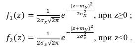 Суммарная случайная величина z(t)=x(t)+y(t)=x(t)±my, определена на двух интервалах: z≥0 и z≤0. При z≥0 случайная величина распределена по нормальному закону с параметрами σx и плюс my, а при z≤0 с параметрами σx и минус my. С учетом вероятности появления положительных и отрицательных значений случайной величины ее плотность распределения можно записать в виде: