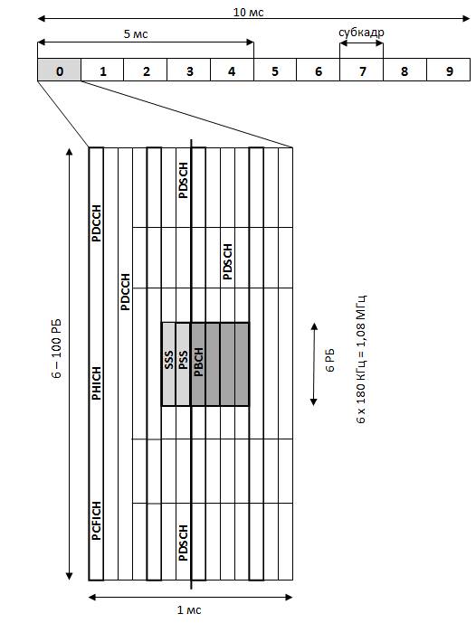 Рис. 12. Распределение канального ресурса в субкадре 0 при частотном дуплексе