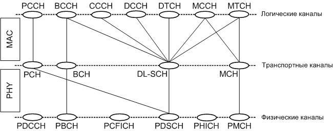 Рис. 4 Взаимосвязь между логическими, транспортными и физическими каналами в нисходящем направлении