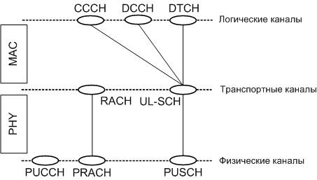 Рис. 5 Взаимосвязь между логическими, транспортными и физическими каналами в восходящем направлении