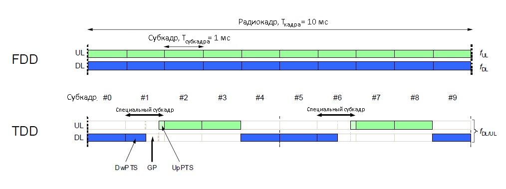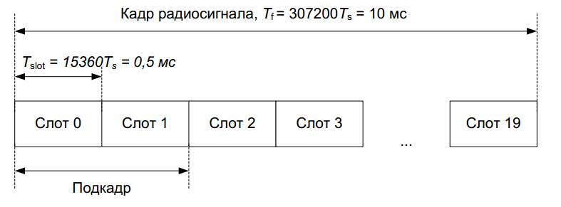 Для взаимной синхронизации E-UTRAN и UTRAN используют тактирование с длительностью временной единицы Ts = 1/(15000×2048)c. Передача по радиоканалу идет кадрами длиной 10 мс, что составляет 307200 Ts. Кадр состоит из 20 временных слотов длиной 15360×Ts = 0,5мс, пронумерованных от 0 до 19. Два последовательных слота составляют 1 субкадр (подкадр) – всего 10 субкадров, от 0 до 9 (рис. 6). Различают 2 структуры кадров: кадры типа 1 при работе с частотным дуплексом (FDD) и кадры типа 2 при работе с временным дуплексом (TDD). На рис. 7. показаны структуры кадров с FDD и TDD.