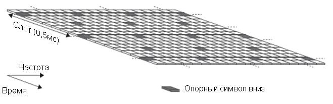 Весь канальный ресурс разделяют на ресурсные блоки (РБ). Ресурсный блок состоит из 12 расположенных рядом поднесущих, занимающих полосу 180 кГц и одного временного слота (7 или 6 OFDM-символов на интервале 0,5 мс). При передаче вниз, от eNB к UE, каждый ресурсный блок состоит из 12×7 = 84 РЭ (при нормальном СР). Ресурсный элемент (РЭ) характеризуется 2-мя параметрами {k,l}, где k определяет номер поднесущей, а l ‒ номер символа в ресурсном блоке. Каждый OFDM-символ состоит из k РЭ, где k – количество поднесущих в выделенных ресурсных блоках. Часть ресурсных элементов используют для передачи опорных (reference) символов (рис. 9). Выделяемый канальный ресурс определяют числом ресурсных блоков или групп ресурсных блоков.