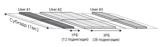 При выделении канального ресурса вверх используют те же понятия ресурсного блока (12 поднесущих общей полосой 180 кГц в слоте), и субкадров длительностью 1 мс с 7 или 6 OFDM-символами в каждом слоте. Пример распределения канального ресурса между разными абонентами (User) проиллюстрирован на рис. 10.