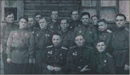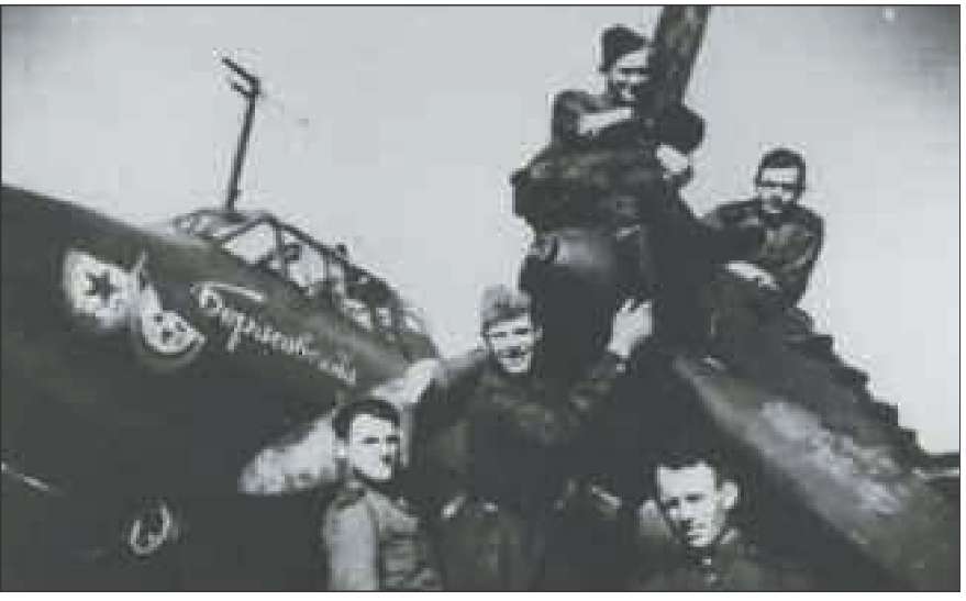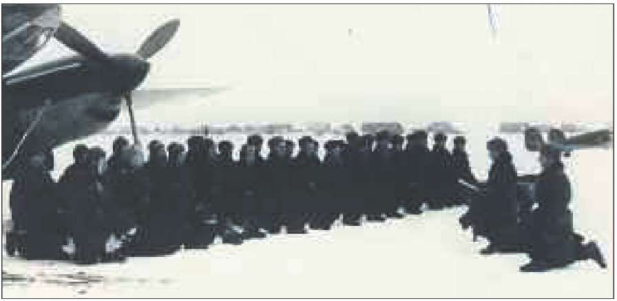 Моя родная 3-я эскадрилья. Сидят (слева направо) комэск М. Малютин, летчик Е. Мелах, штурман Е. Шацкий. Механики (крайний ряд слева направо) Ленченко, Александров, Силантьев, Бельский