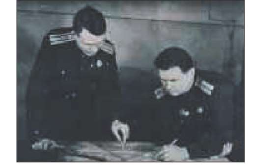 Гвардейцы – начальник разведки полка М. Морозов слева и штурман полка А. Никулин уточняют маршруты полетов в тыл фашистов.