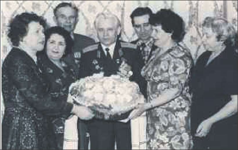 эскадрильского «метеобога» (слева), рядом – Лиля Дерябичева. Пирог – хлеб-соль – весом в один пуд принимает Виктор Петров, ему помогает Валя Петрова
