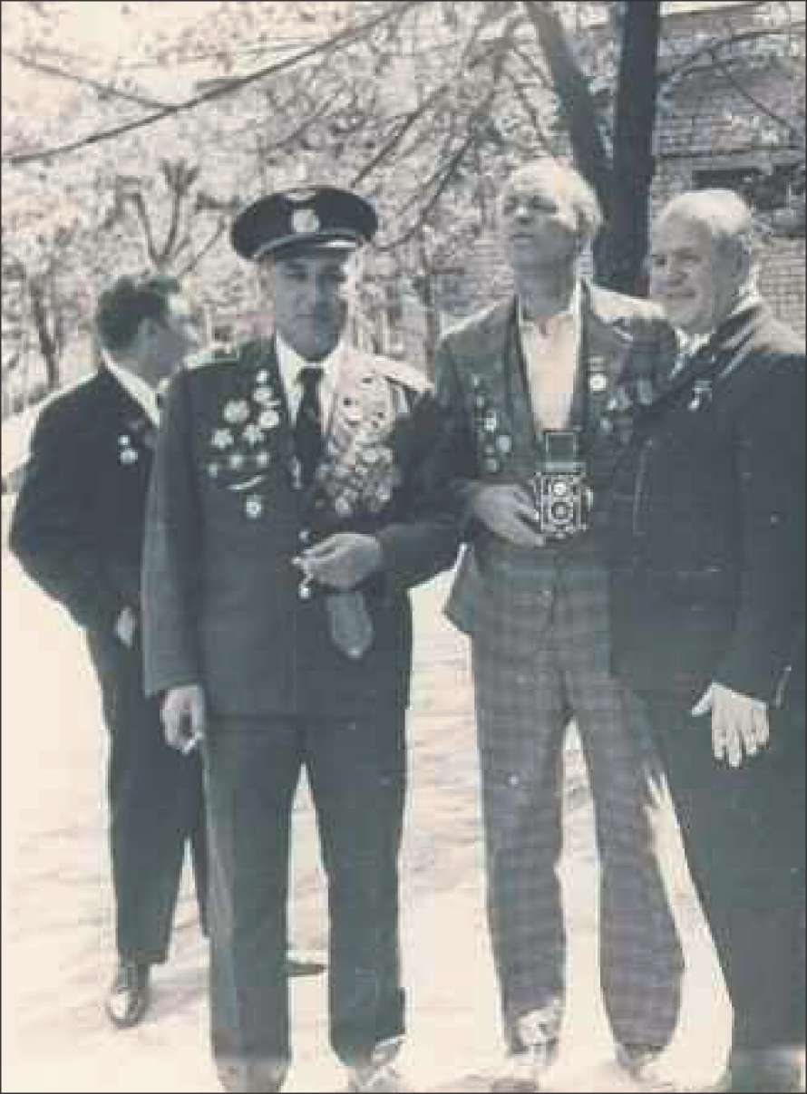 День Победы. В гостях у Юры Дерябичева в Калининграде (ныне Тверь). Собрались однополчане из разных городов. Хозяин дома (слева) вместе с автором книги и Анатолием Поповым, Героем Советского Союза. Он летал на моих двух первых «пешках».