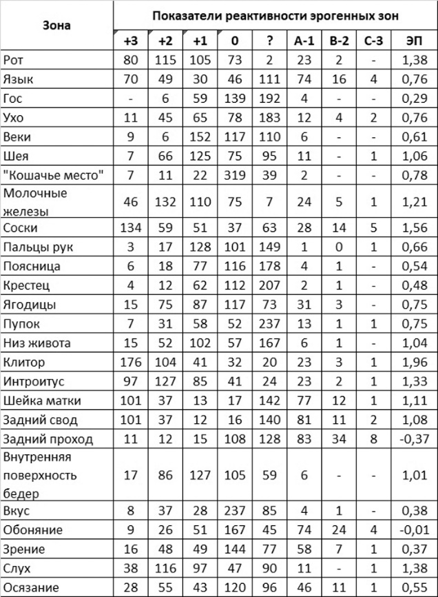 По данным А.М. Свядоща (1974), индивидуальная архитектоника эрогенной реактивности зон второго порядка позволяет различать генерализованный, вагинальный, клиторический и ареактивный типы оргазма. Усредненная оценка реактивности эрогенных зон у 400 женщин по шкале в диапазоне от + до -3 баллов [Здравомыслов В. И., 1972] представлена в таблице 1.