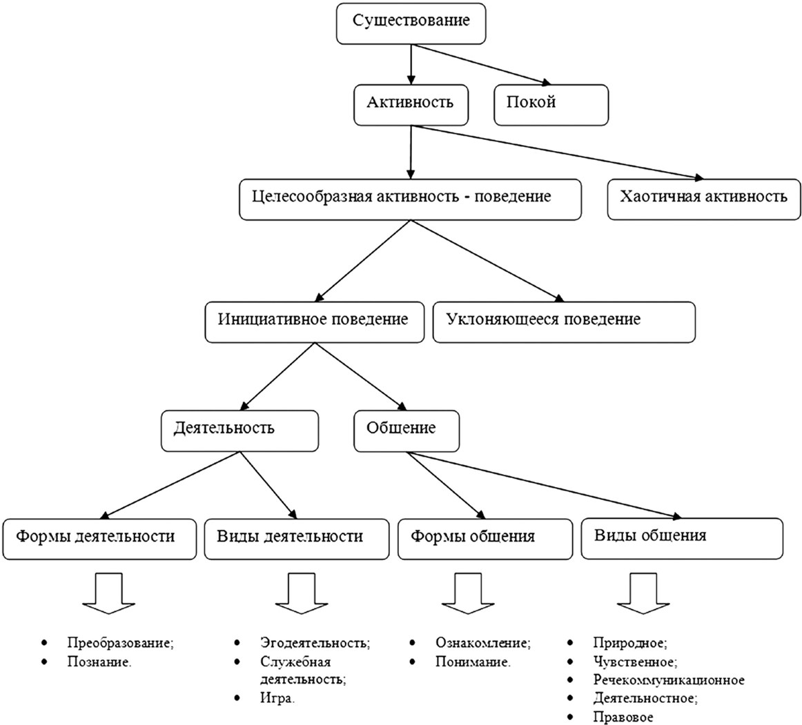 Одна из проблем познания деятельности состоит в том, что в настоящее время категории, отражающие различные проявления человеческой активности, например, такие, как «жизнедеятельность», «поведение», «деятельность», «общение» в научной литературе не соотнесены между собой. Они употребляются в обществоведении и науках о человеческом поведении либо как интуитивно ясные, либо метафорически поясняются друг через друга.