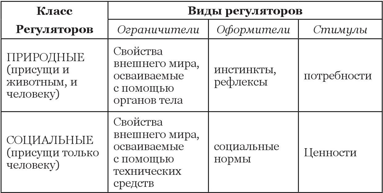 В первом столбце таблицы указаны виды регуляторов, которые можно условно разделить на два класса: природные и социальные. Назовем природными регуляторами те, что свойственны и человеку, и животным, а социальными те, что свойственны только человеку.